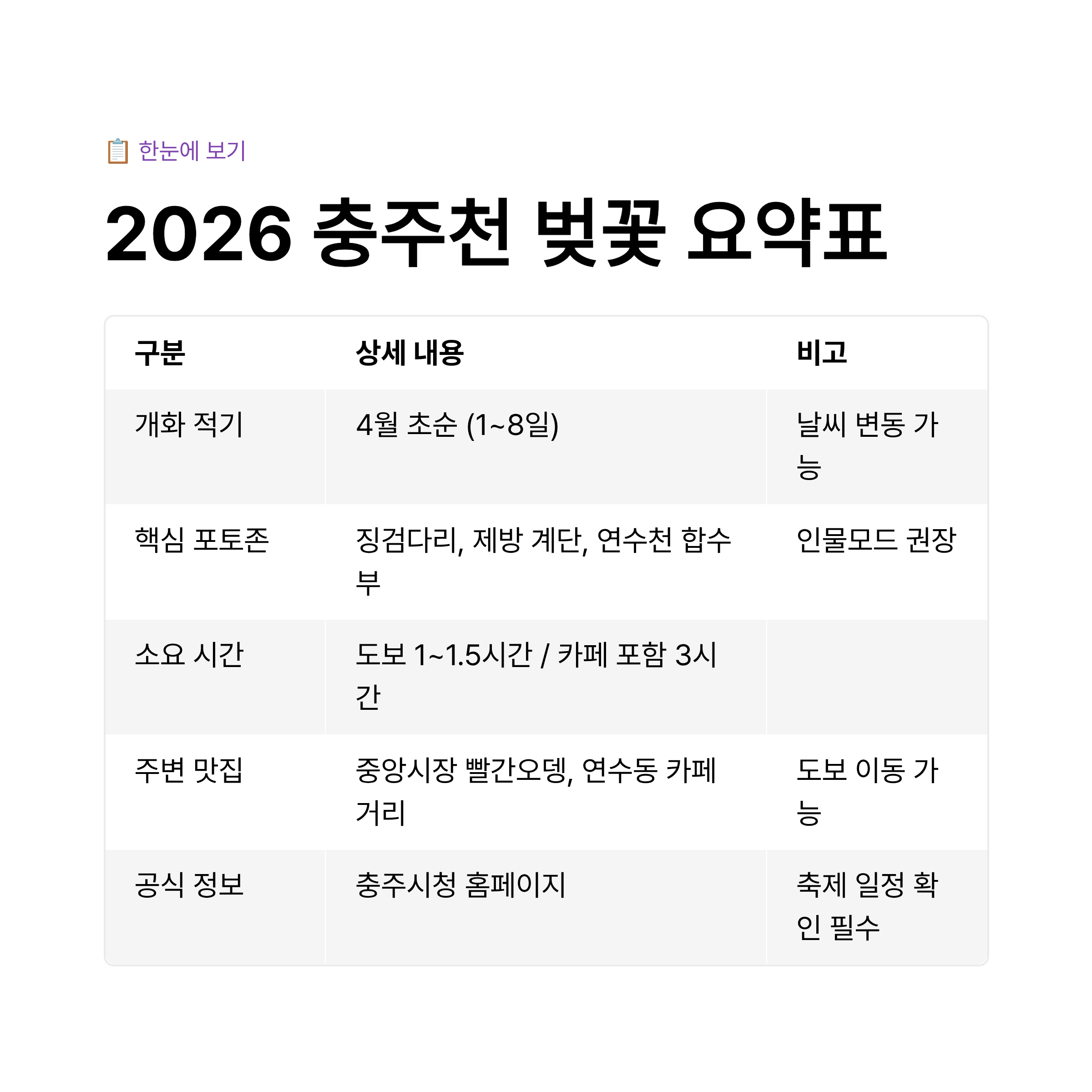 4. 2026 충주천 벚꽃 여행 한눈에 보기 (요약표)