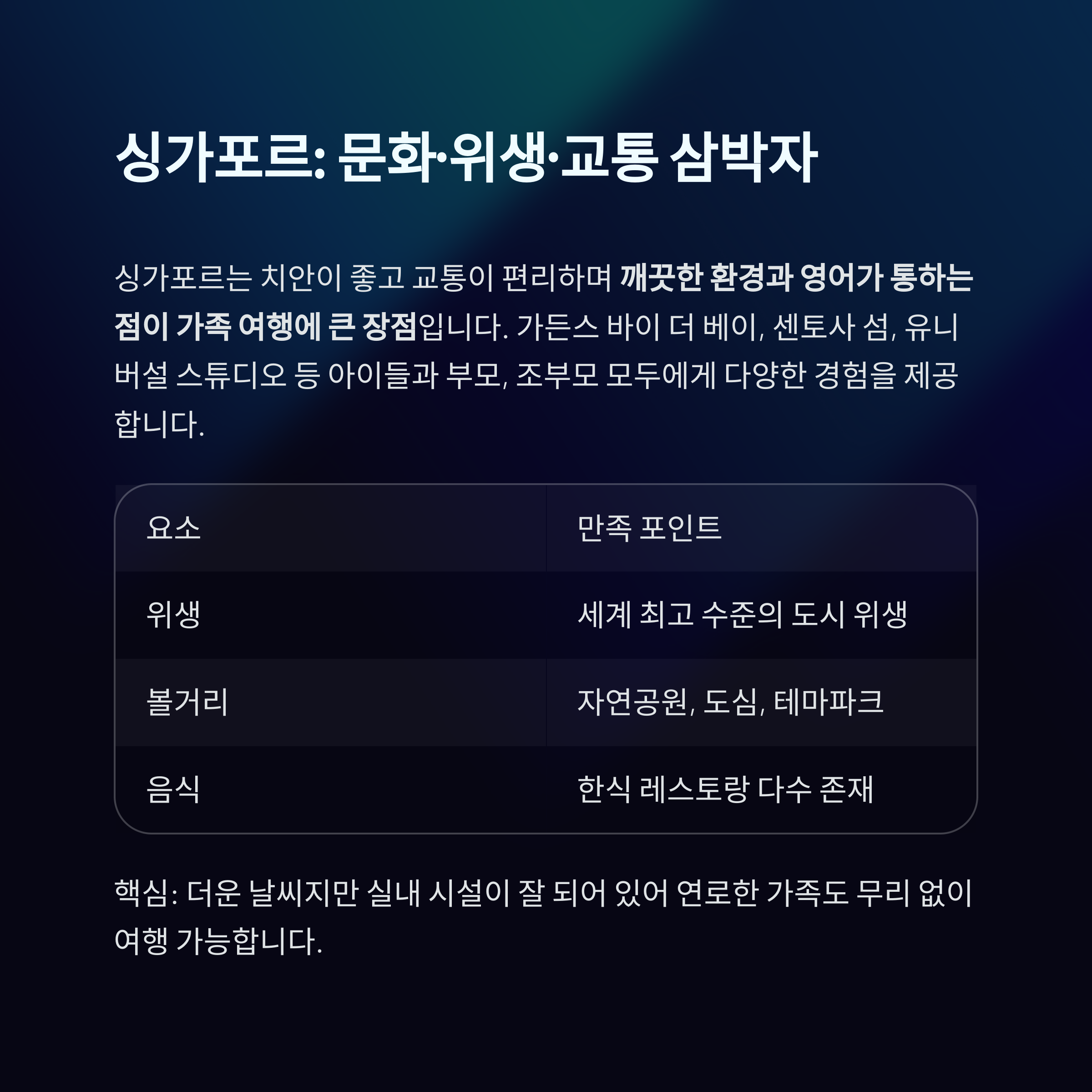 깨끗한 환경과 영어가 통하는 점이 가족 여행에 큰 장점입니다.