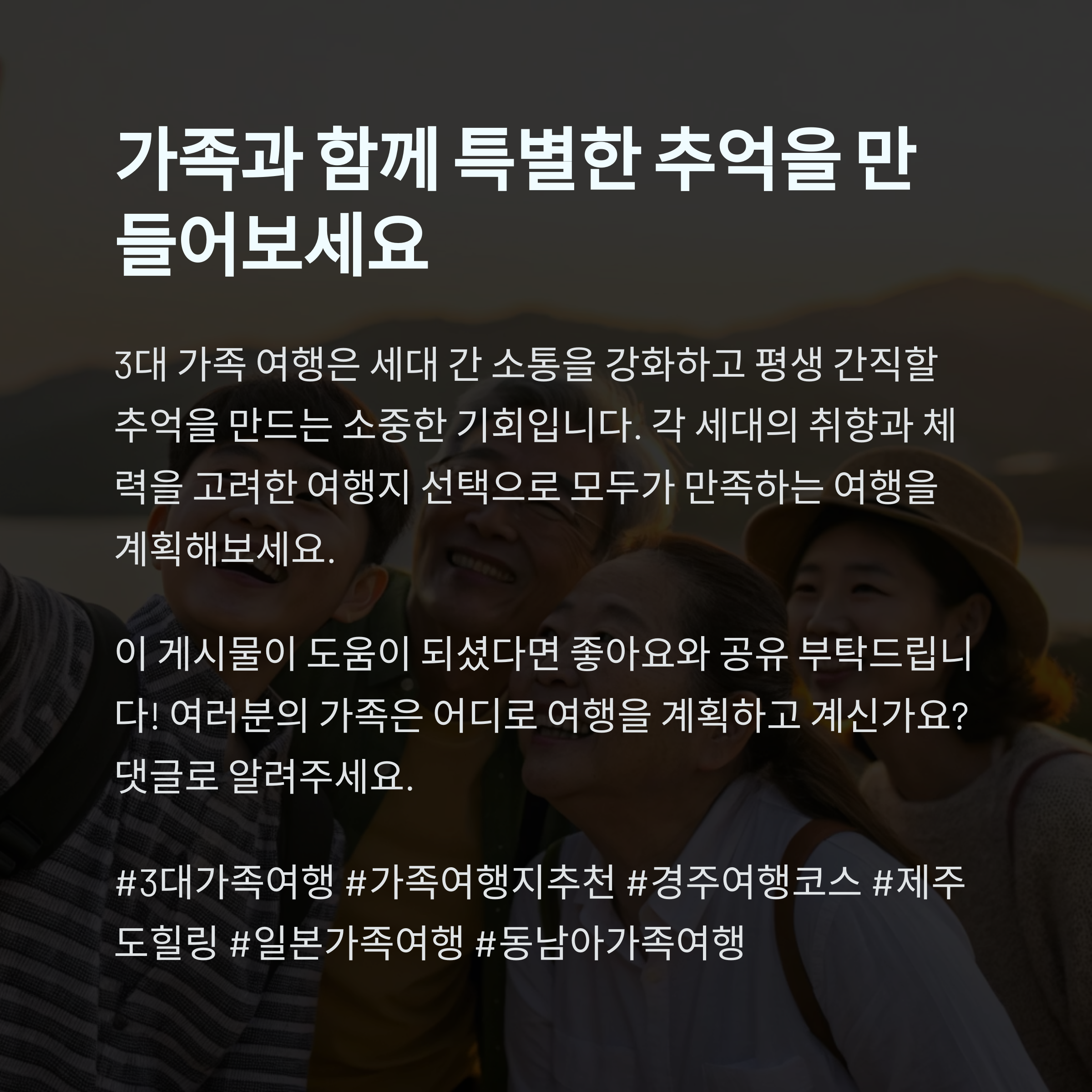 이번 글에서는 3대 가족이 함께 떠나기 좋은 국내외 여행지를 정리했습니다.
