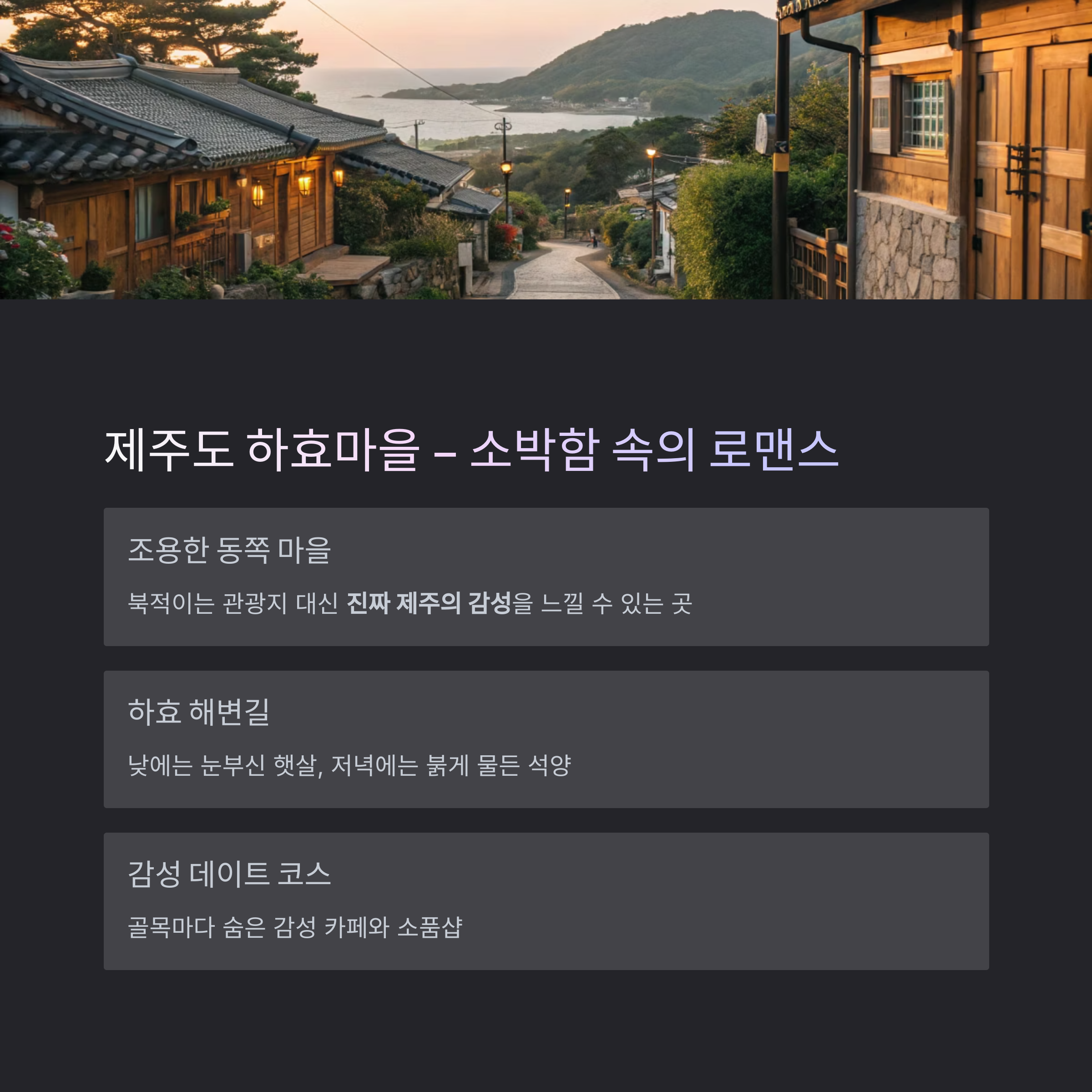 성산일출봉이나 협재처럼 북적이는 장소 대신, 조용한 동쪽 마을 하효는 진짜 제주의 감성을 전합니다.