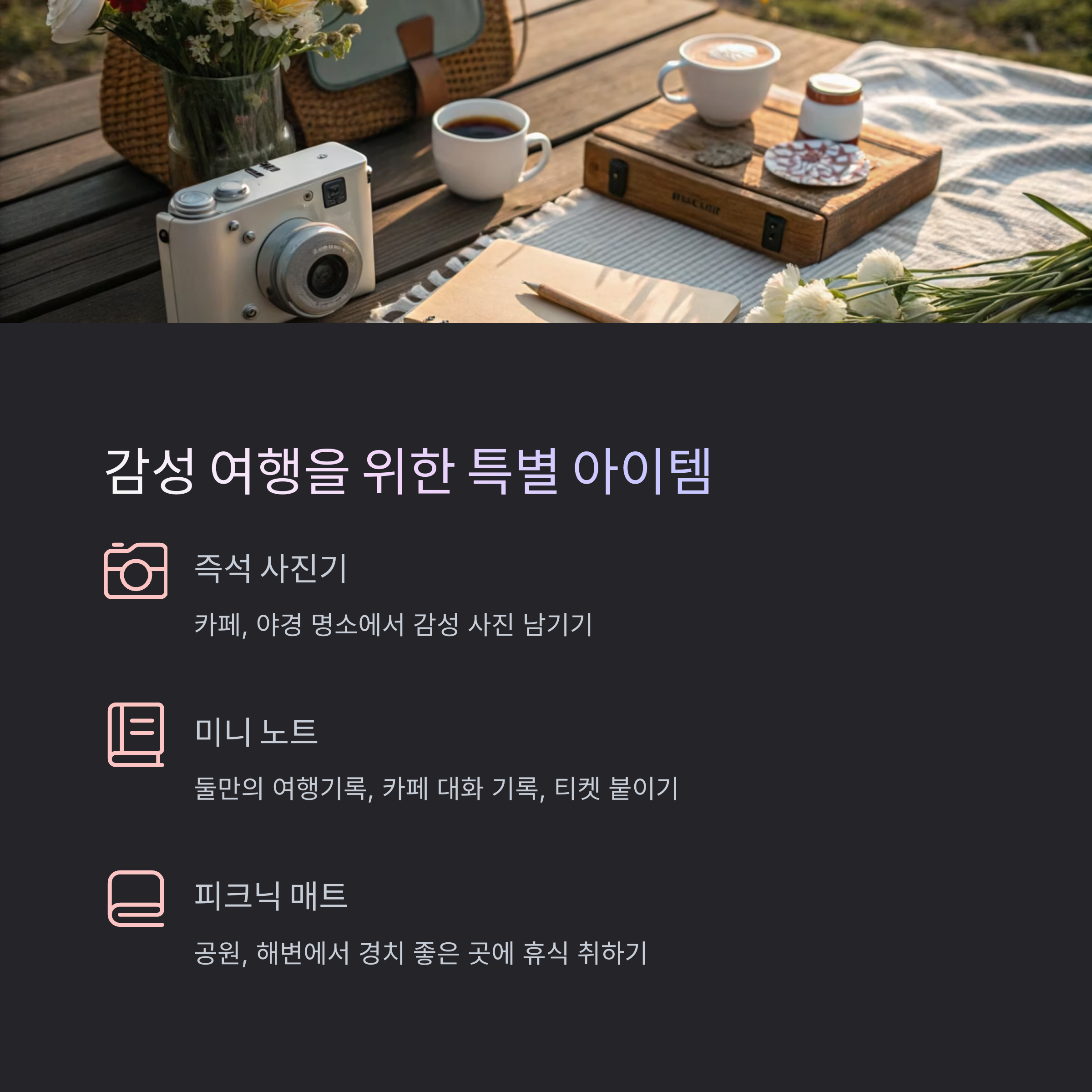 | 즉석 사진기 | 감성 사진 남기기 | 카페, 야경 명소에서 활용 |