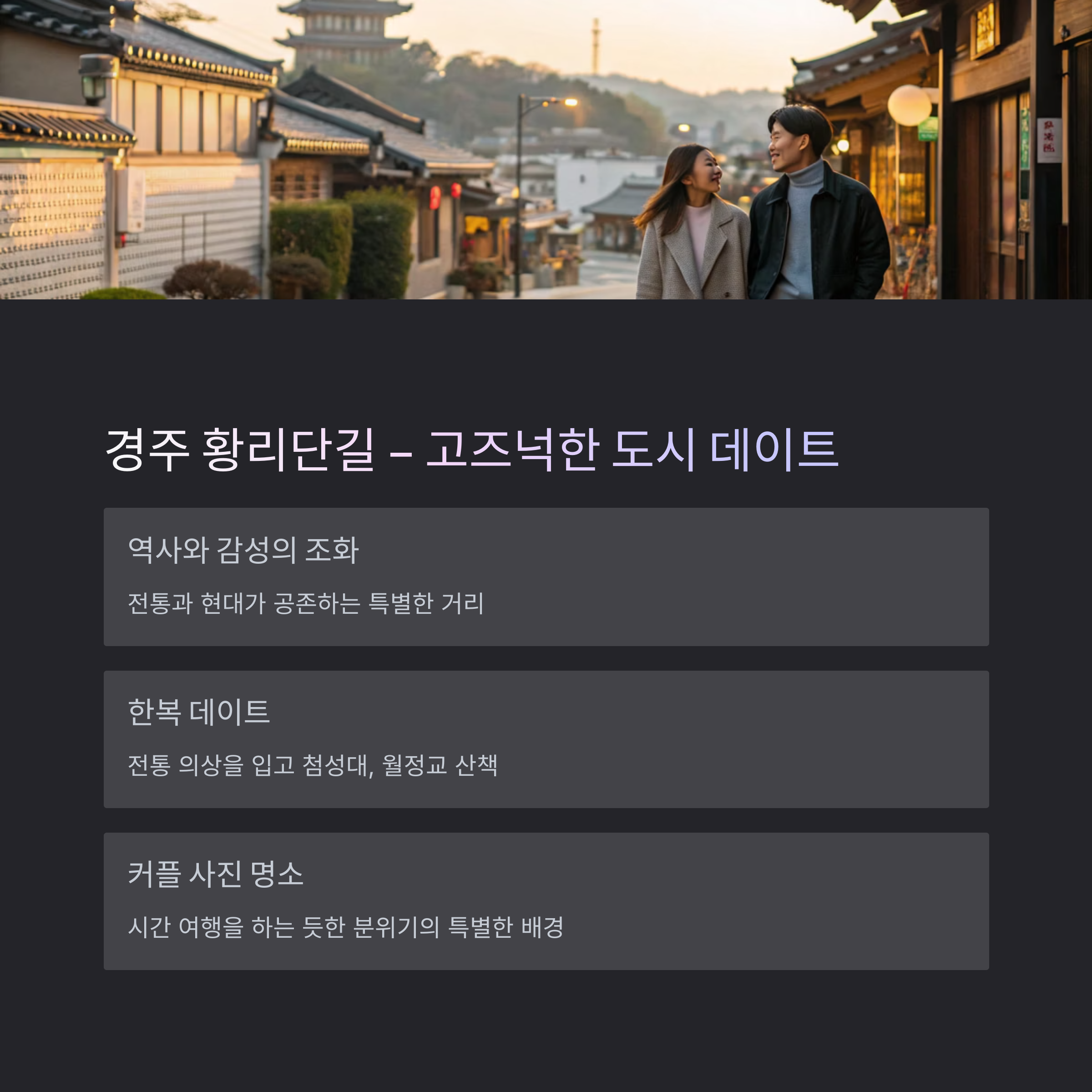 경주의 황리단길은 역사와 감성 카페, 전통 의상 체험이 공존하는 여행지입니다.
