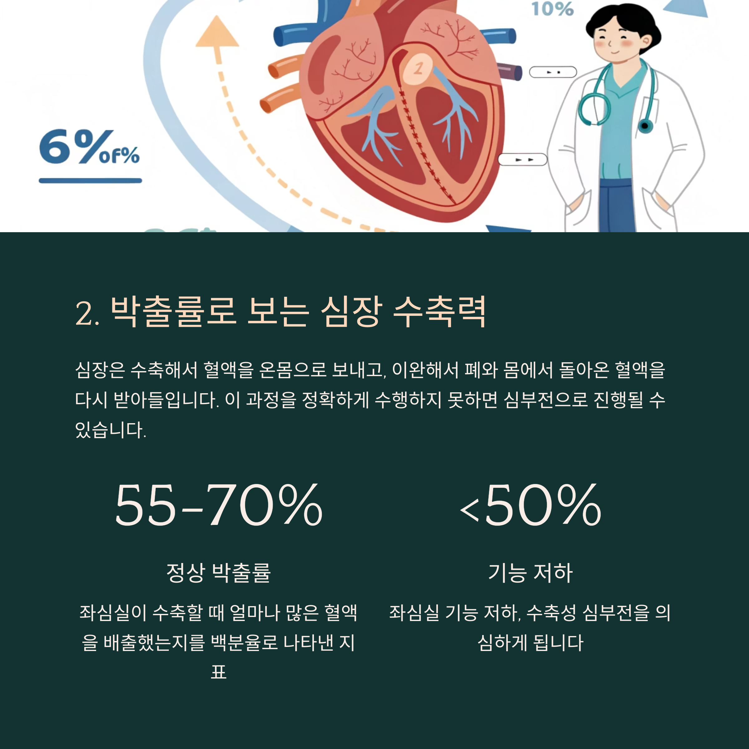 50% 이하라면 좌심실 기능 저하, 수축성 심부전을 의심하게 됩니다.