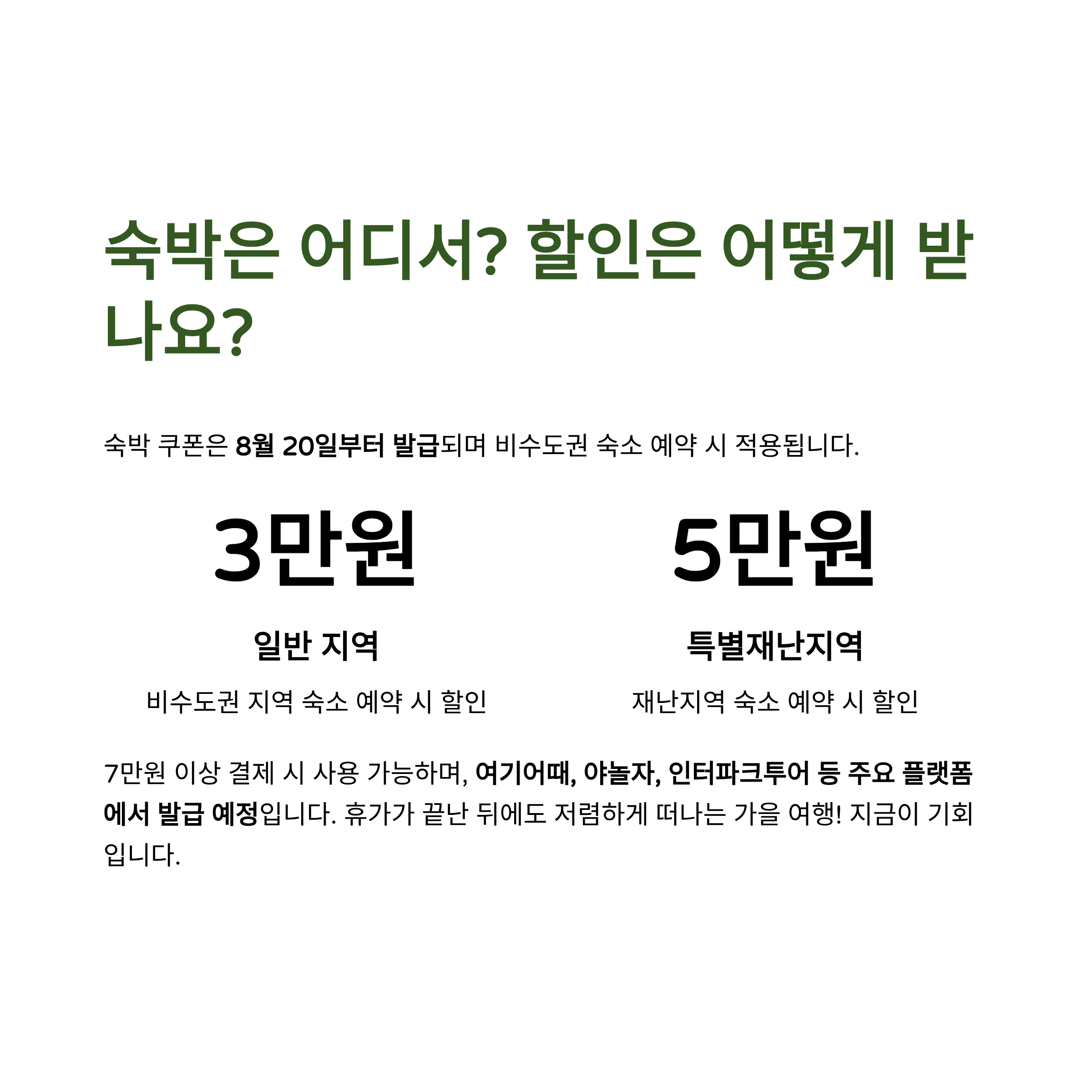 | 숙박 | 80만 장 | 최대 5만원 | 비수도권, 7만원 이상 숙박 예약 시 (8/20~) |