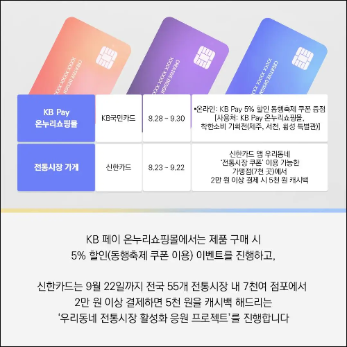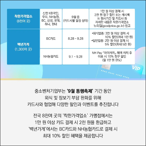 다가오는 9월 동행축제에서는 많은 소비자들이 주목해야 할 다양한 카드사 할인 혜택이 준비되어 있습니다. 중소벤처기업부와 카드사들이 협업하여 외식, 장보기, 전통시장 쇼핑 등을 더 저렴하게 즐길 수 있는 다양한 기회를 제공하는데요, 명절을 앞두고 더 합리적인 소비를 하고 싶은 분들을 위해 이번 기회를 놓치지 마세요. 지금부터 카드사별 혜택을 자세히 살펴보겠습니다.