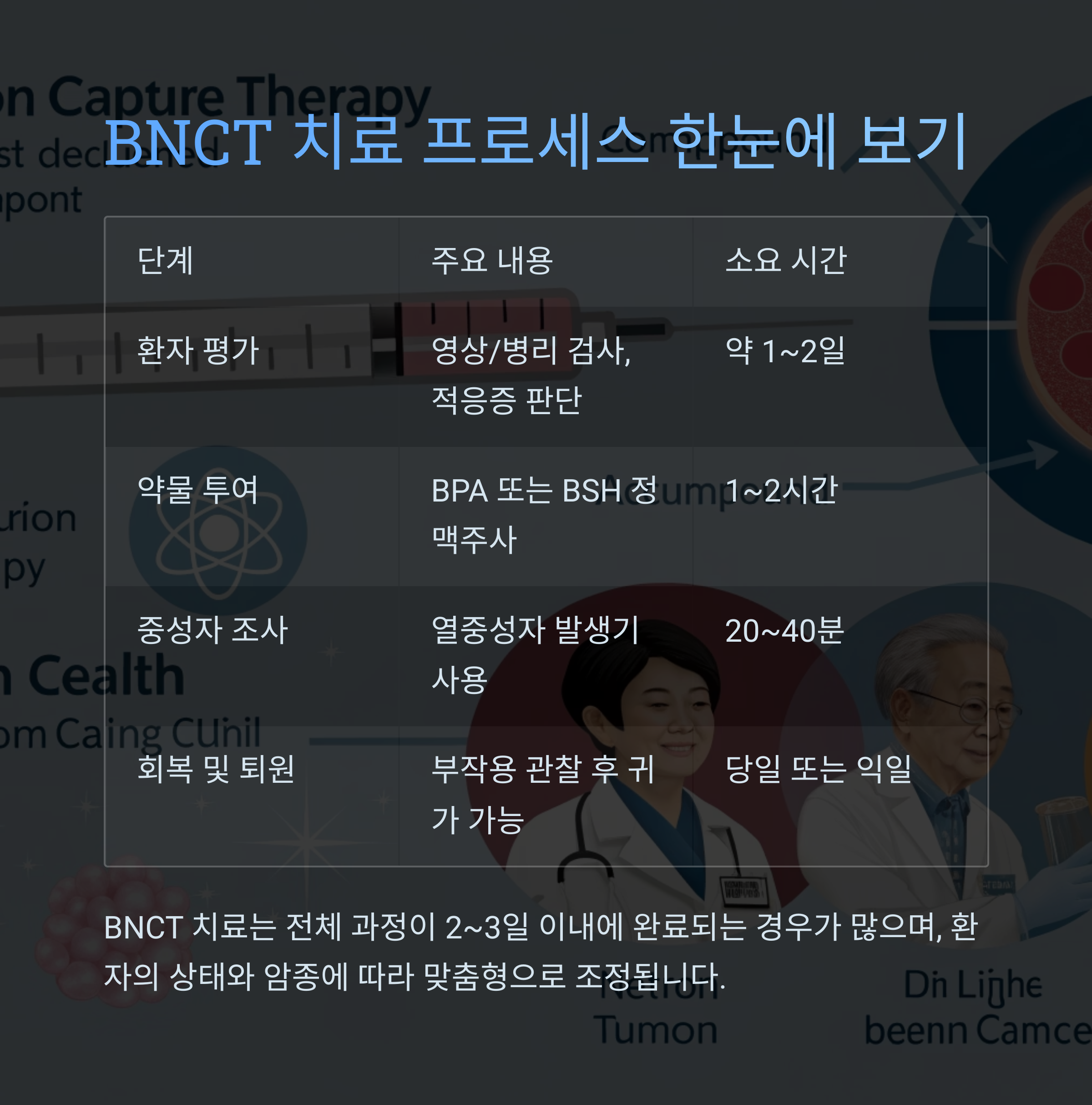 모든 과정이 환자 맞춤형으로 설계되며, 적절한 약물 투여 타이밍, 붕소 농도 측정, 조사 시간과 각도 등이 치료 효과에 결정적인 영향을 줍니다.