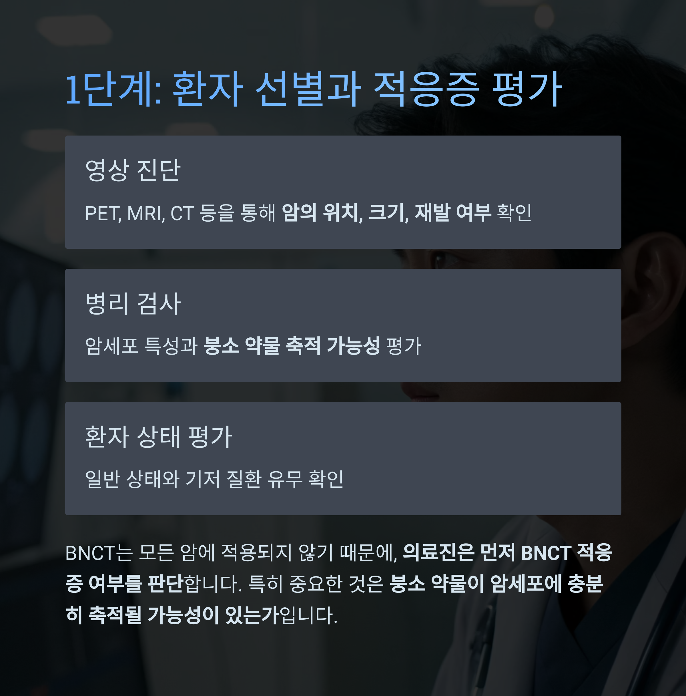 BNCT는 모든 암에 적용되지 않기 때문에, 의료진은 먼저 BNCT 적응증 여부를 판단합니다.