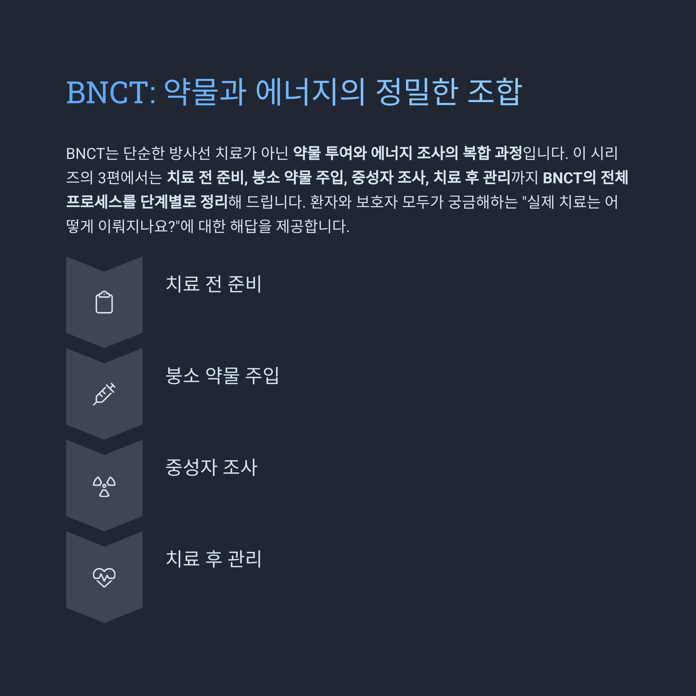 이번 BNCT 시리즈의 3편에서는 치료 전 준비, 붕소 약물 주입, 중성자 조사, 치료 후 관리까지 BNCT의 전체 프로세스를 단계별로 정리해 드립니다.