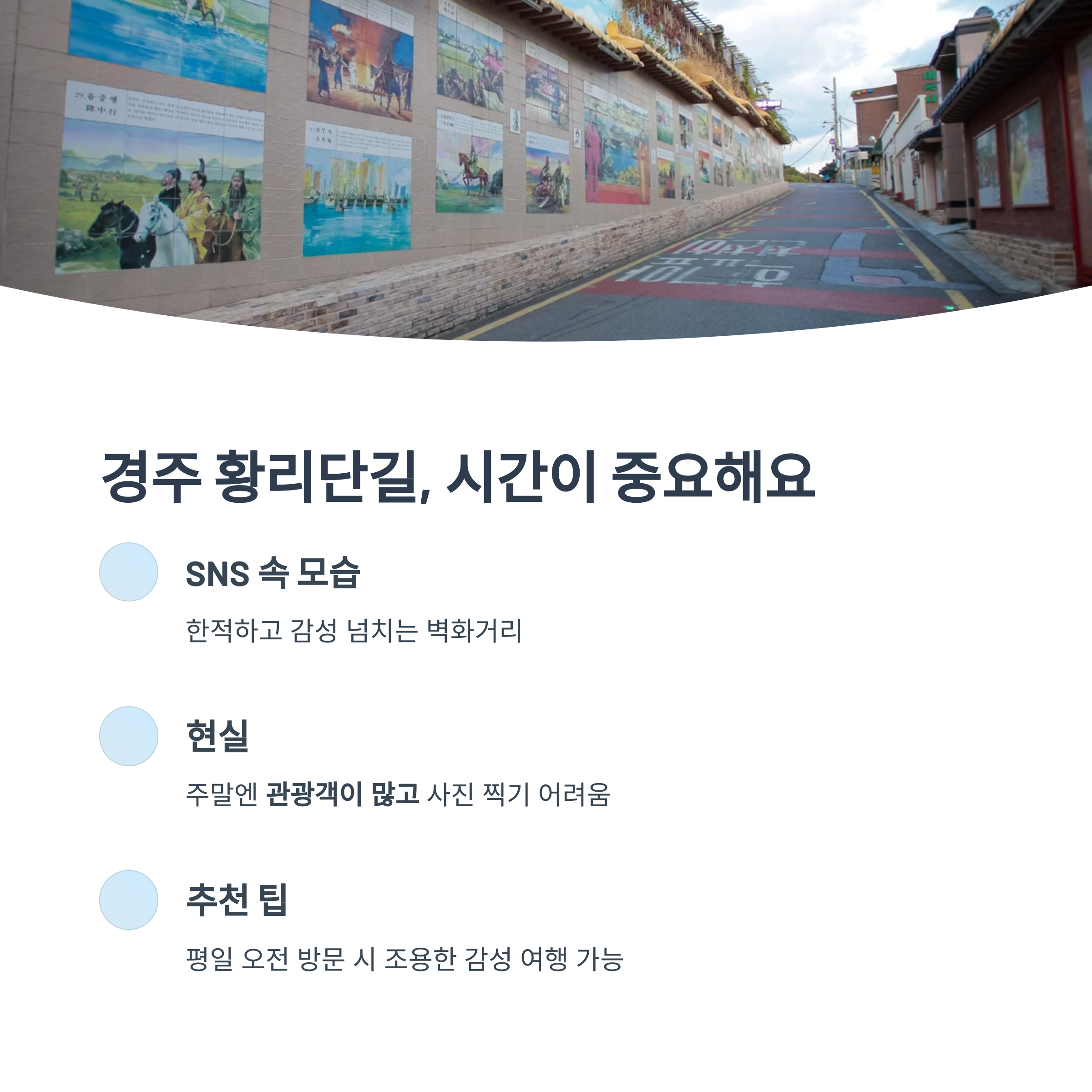 | 경주 황리단길 | 감성 벽화 골목 | 관광객 많음 / 평일 방문 추천 | 시간 선택 중요 |